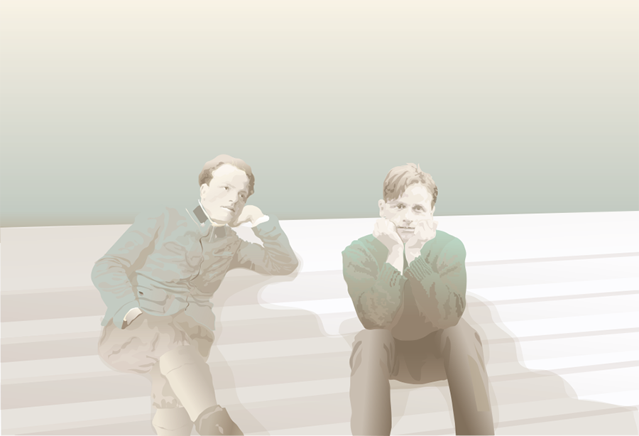 Vater und Schwiegersohn , als junge Männer von Anfang 20. Verwendet wurden ein Foto des Vaters aus dem Jahr 1915 während des 1.Weltkriegs, als junger k.u.k. Leutnant. Das Foto seines Schwiegersohnes ist von 1981 am alten jüdischen Friedhof in Wien: er sitzt auf der Einfassung eines Grabes, hinter ihm ein verwitterter Grabstein mit wild wuchernden Gebüsch und ist stoned. Auf dem gemeinsamen Bild sitzen sie nun auf der Treppe, die zu einem Ashram in Indien führt.