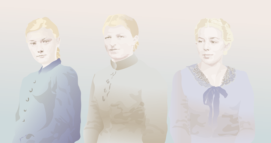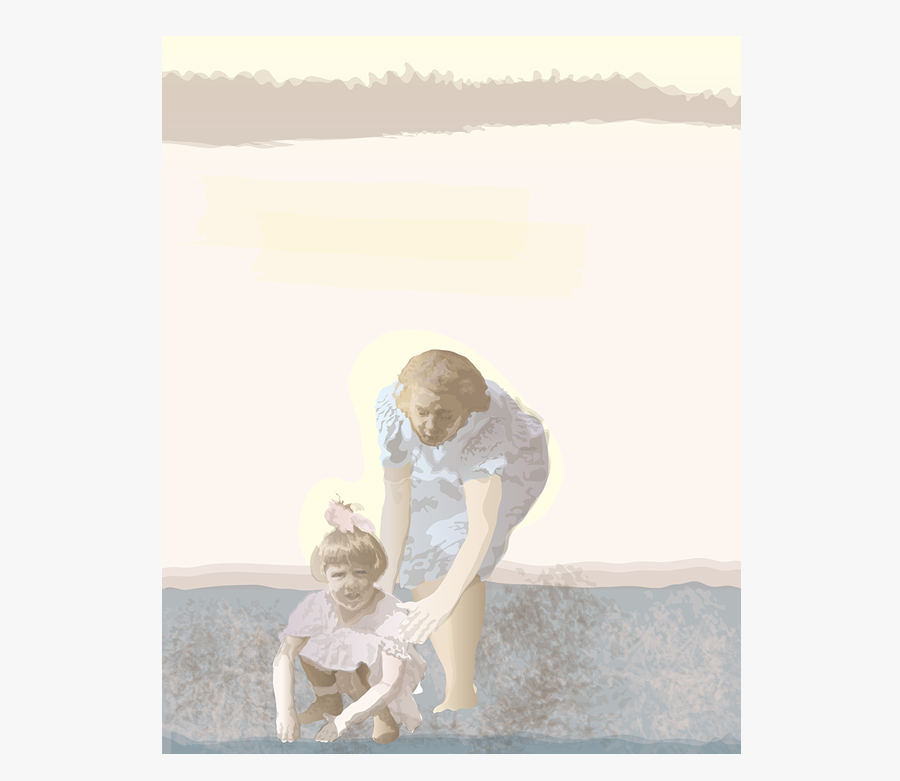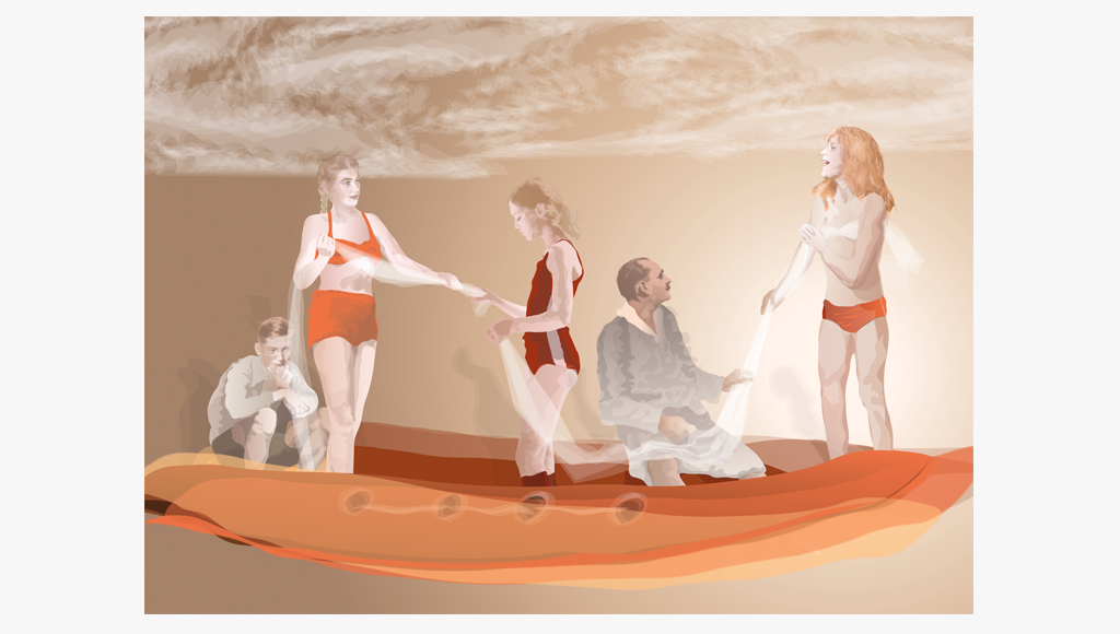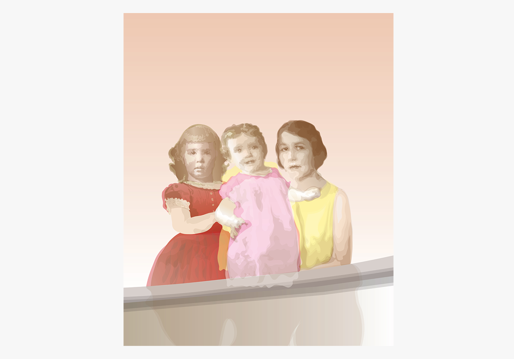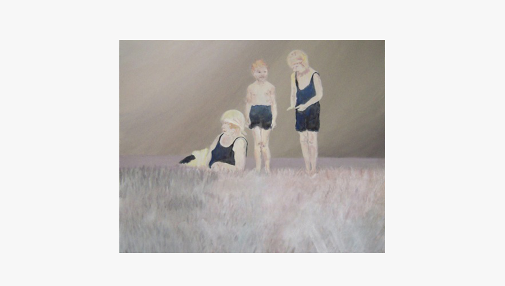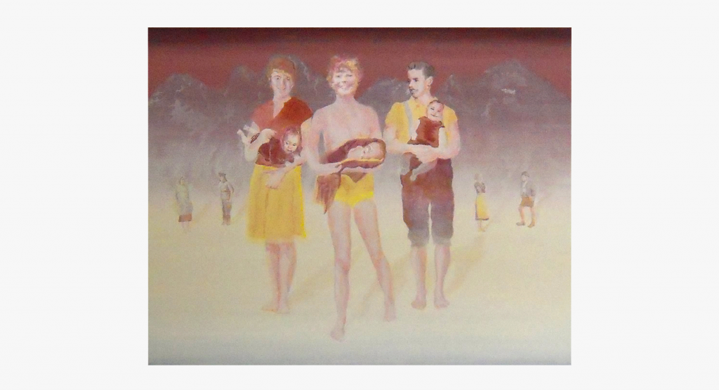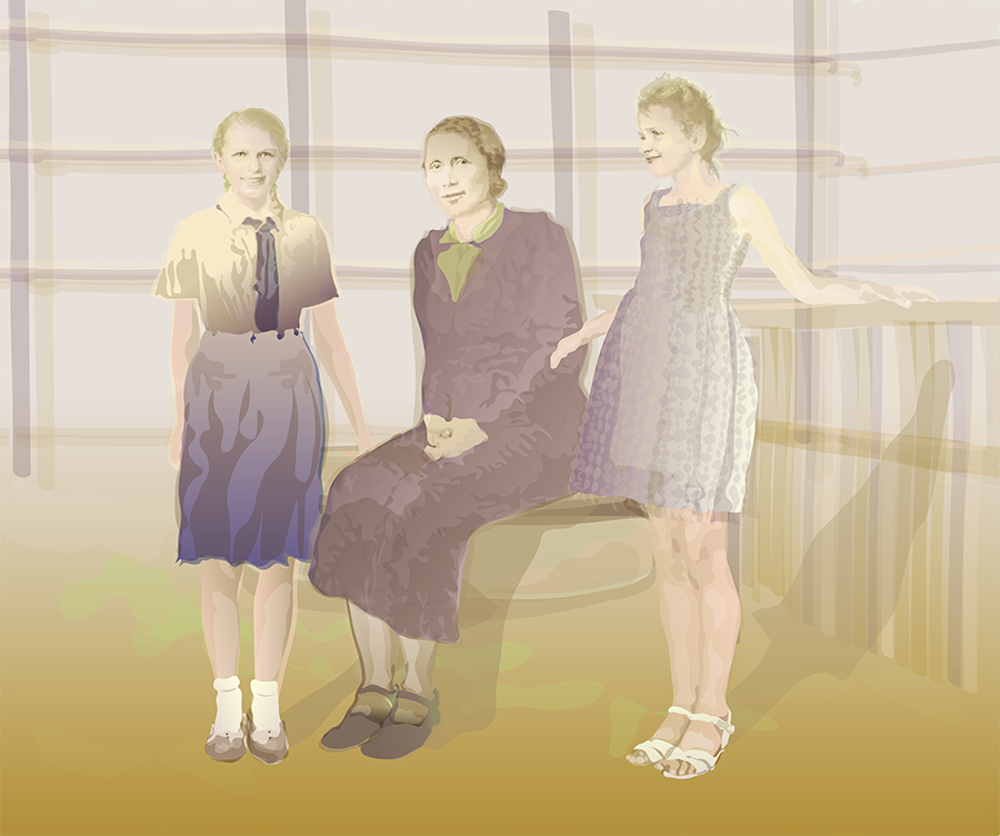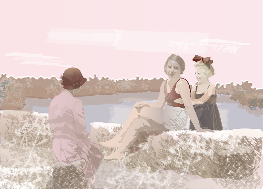 Großmutter, Mutter und Tochter, Mutter und Tochter als Kinder. Auf dem Foto der Großmutter ist sie eine junge Frau Anfang zwanzig, und liegt im hohen Gras. Daneben ihre Tochter, etwa sechs Jahre alt und tief konzentriert, aber glücklich in der Gruppe der Badegäste –Familie und Freunde. Die Enkelin in der Mitte, ihre Tochter, ist noch ein Kleinkind, auf ihrem Foto steht sie allein am Meeresstrand. Die gemeinsame Szene istein Dorfbad in den Zwanziger Jahren.