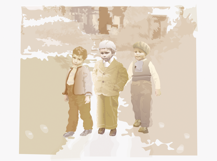 Sohn und sein Vater, beide im Alter von ungefähr neun Jahren. Für den Vater standen zwei Fotos von seiner Firmung zur Verfügung, eines vor dem Haus und eines auf dem Feld. Der Sohn ist zu Hause fotografiert worden. Das Feld ist der Bildraum.