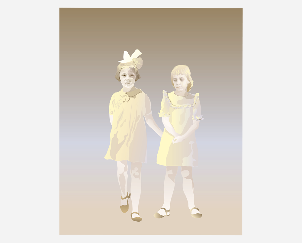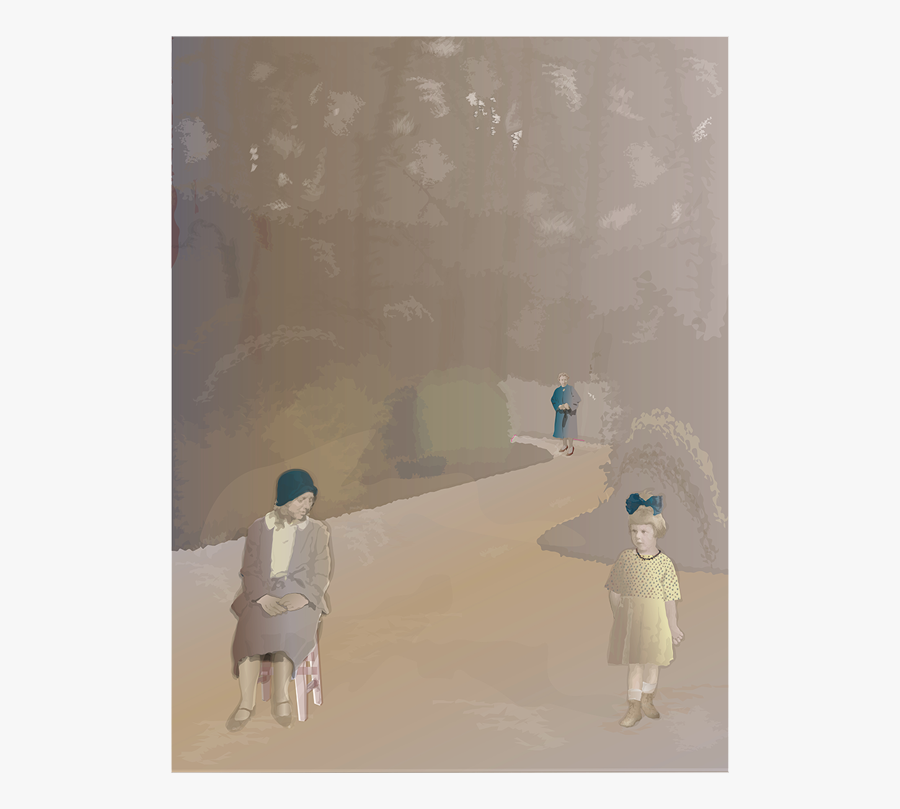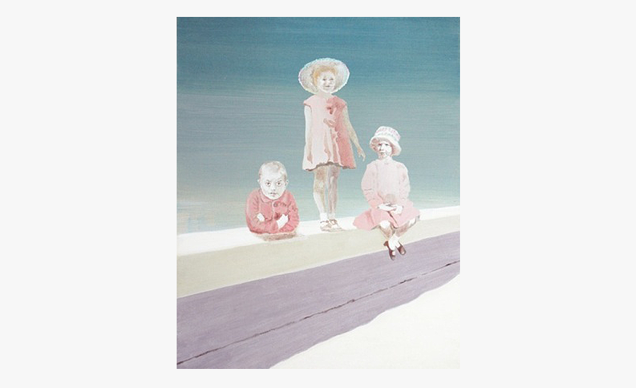 Tochter (rechts) und Mutter (links), gleichaltrig mit etwa neun Jahre, in der Mitte deren Mutter bzw. Großmutter. Beide Mädchen berühren sie leicht. Sie wird früh sterben und ihre Enkelin nicht kennen. Grundlage war ein Familienfoto der Mutter mit allen Geschwistern und beiden Eltern. An den Uniformen und Zöpfen der Mädchen erkennt man die 40iger Jahre. Auf dem Kinderfoto der Tochter lehnt sie in ihrem schönsten Kleid am Zaun. Bildraum ist der elterliche Hof mit dem Brunnen, auf dem die Großmutter sitzt.