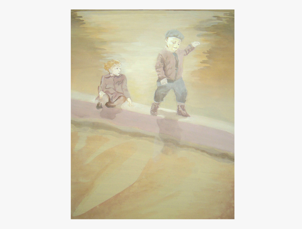 Vater und Mutter der Künstlerin, in der Mitte sie selbst, alle drei als Kinder von ungefähr 5 Jahren. Verwendet wurde das einzige Kinderfoto des Vaters aus dem Jahr 1896. Er stützt sich auf die Rücklehne eines Sessels, auf dem seine kleine Schwester sitzt. Das Foto der Mutter ist aus dem Jahr 1922. Sie sitzt neben ihrem jüngeren Bruder auf einer Bank im Garten ihrer Großmutter. Auf dem Kinderfoto der Künstlerin aus dem Jahr 1956 (das auch als Vorlage für den Bildraum dient) steht sie auf der Mauer einer Strandpromenade neben ihrem Vater, der da schon 65 Jahre alt ist. Auf einem ganz ähnlichen Foto, das nur Sekunden später aufgenommen wurde, wird dort ihre Mutter stehen. Dahinter unsichtbar ist das Meer.