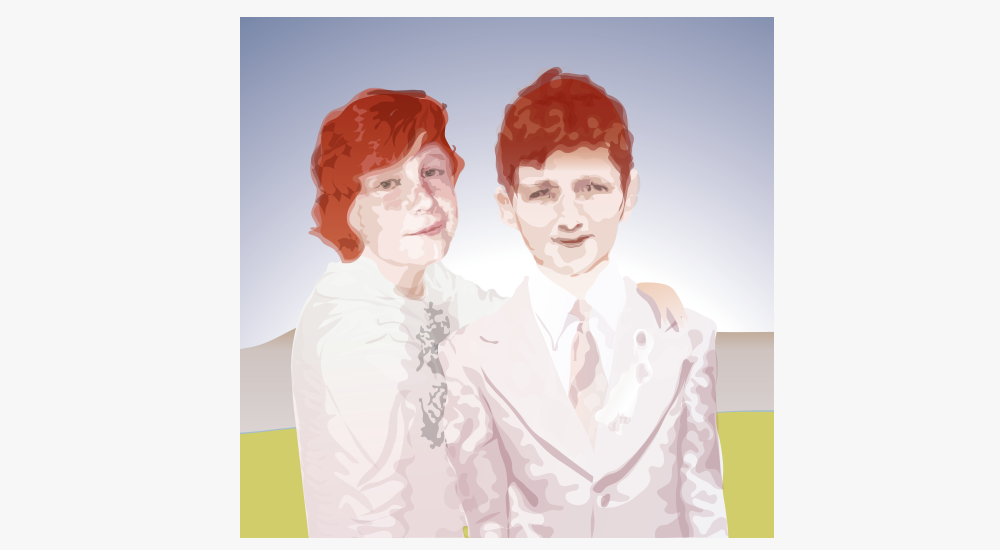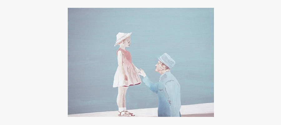 Vater und Tochter. Er ist um 40 Jahre verjüngt – so wie sie sich das als Kind gewünscht hatte. Verwendet wurde ein Jugendbild des Vaters aus dem Ersten Weltkrieg. Sein Hund sitzt vor ihm und gibt ihm die Pfote. Auf dem Kinderfoto seiner Tochter steht sie auf der Mauer an der Strandpromenade und schaut zu ihrer Mutter herunter.