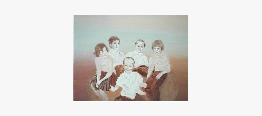 Eine Familie, die auf einem Heuhaufen sitzt. Rechts außen der Vater ungefähr fünf Jahre alt, links außen die Mutter als ungefähr sechsjährige, ihre Söhne zwischen ihnen. Ganz vorne der jüngste in strahlender Laune. Für die Mutter wurden zwei Kinderfotos verwendet: als Prinzessin mit Krone auf einem Faschingsfest und ein zweites nachdenklich im Faltenrock auf einem Familienausflug.