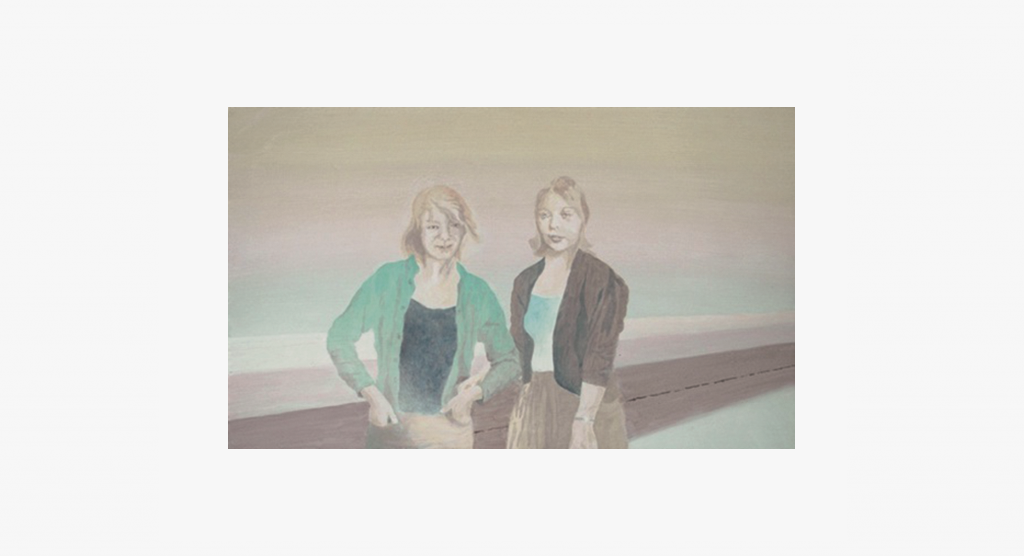 Mutter und Tochter, beide als junge Frauen. Für die Mutter wurde zunächst ein feierliches Portraitfoto von 1935 verwendet, auf dem sie ein schwarzes Samtkleid mit Spitzenkragen trägt. Es wurde kombiniert mit einem späteren Foto aus den 50iger Jahren. Dort steht sie auf einer Wiese im Sommer und hält ihre kleine Tochter an der Hand. Ein Foto der Tochter im Hof der Kunstakademie: sie trägt eine Jacke aus den 50iger Jahren, die von ihrer Mutter stammt. Der gemeinsame Raum ist wieder die Strandpromenade in Norditalien, aber das Wetter ist jetzt veränderlich.