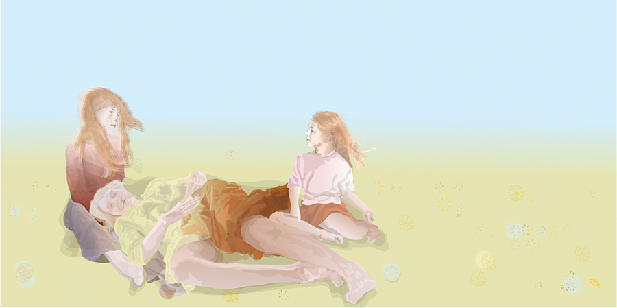 Drei Fotos sind die Grundlage dieses Portraits meiner Mutter: Auf dem erste sitzt sie mit ihrer Familie an einem Gartentisch. Das zweite entstand anlässlich eines Ausfluges zu einem See, der auch den gemeinsamen Raum bildet. Auf dem Kinderfoto steht sie vor einem Strauch im Garten. Es ist eines der ganz wenigen Kinderbilder auf denen sie lacht.
